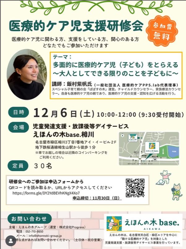 12月6日(土)、名古屋市天白区にあるえほんの木base.相川様にて【医療的ケア児支援研修会】が開催されます。